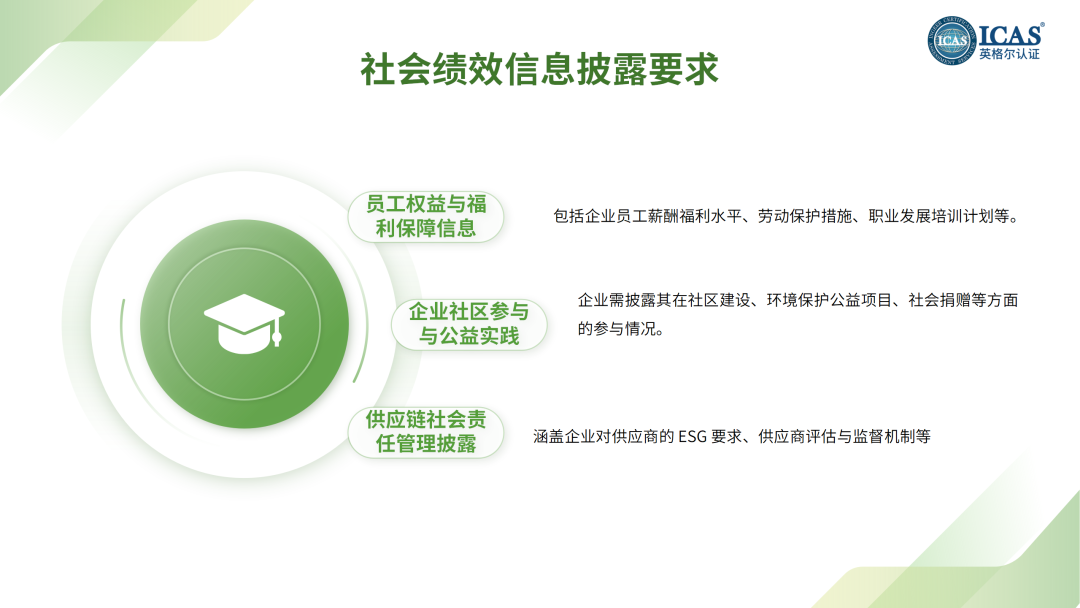 社會績效信息披露,要求企業披露員工薪酬福利水平、勞動保護措施、職業發展培訓計劃等員工權益與福利保障信息。同時,企業需披露其在社區建設、環境保護公益項目、社會捐贈等方面的參與情況,以及對供應商的 ESG 要求、供應商評估與監督機制等供應鏈社會責任管理披露內容。