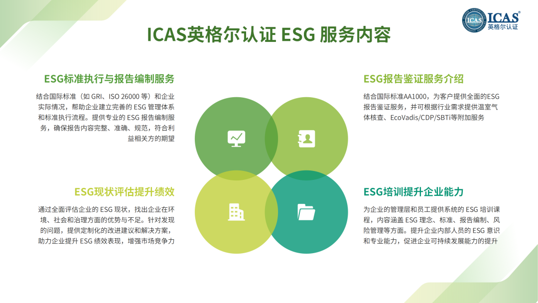 ICAS 英格爾認證憑借專業資質與經驗,為企業提供優質的 ESG 服務,助力企業在全球市場競爭中實現可持續發展目標。