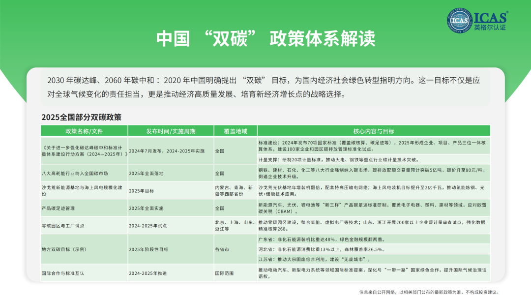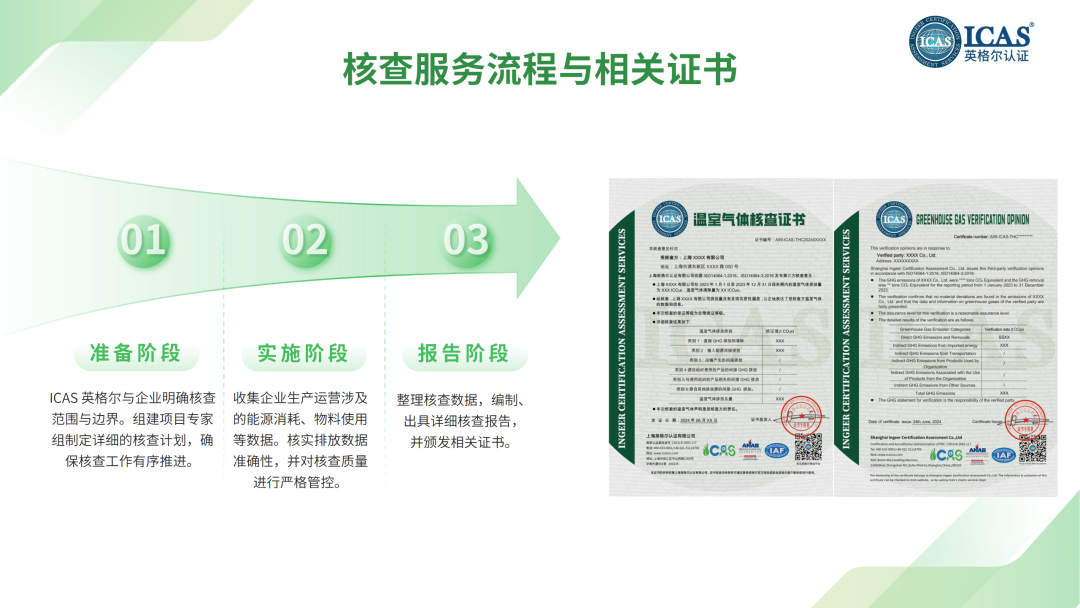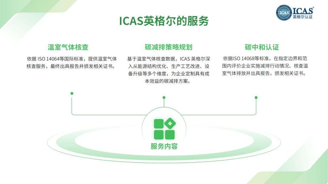 在中國“雙碳”政策引領(lǐng)下,溫室氣體的盤查與第三方核查貫穿相關(guān)企業(yè)綠色轉(zhuǎn)型全鏈條,ICAS 英格爾認(rèn)證,為企業(yè)提供全面高效的一站式服務(wù),助力企業(yè)打造低碳標(biāo)桿,進(jìn)一步推動綠色轉(zhuǎn)型,增強國際競爭力。