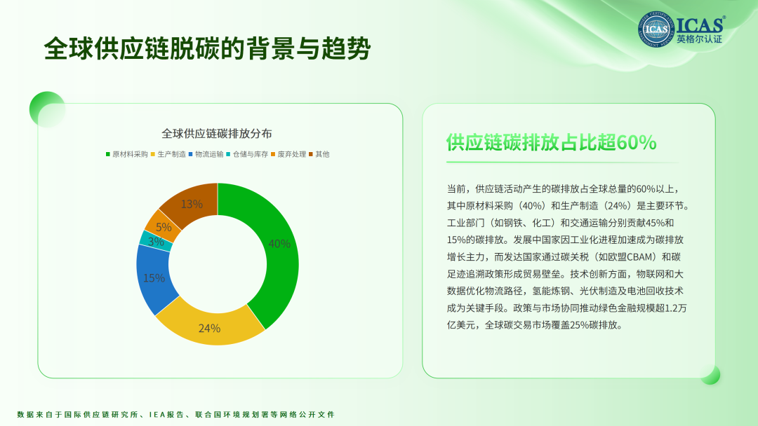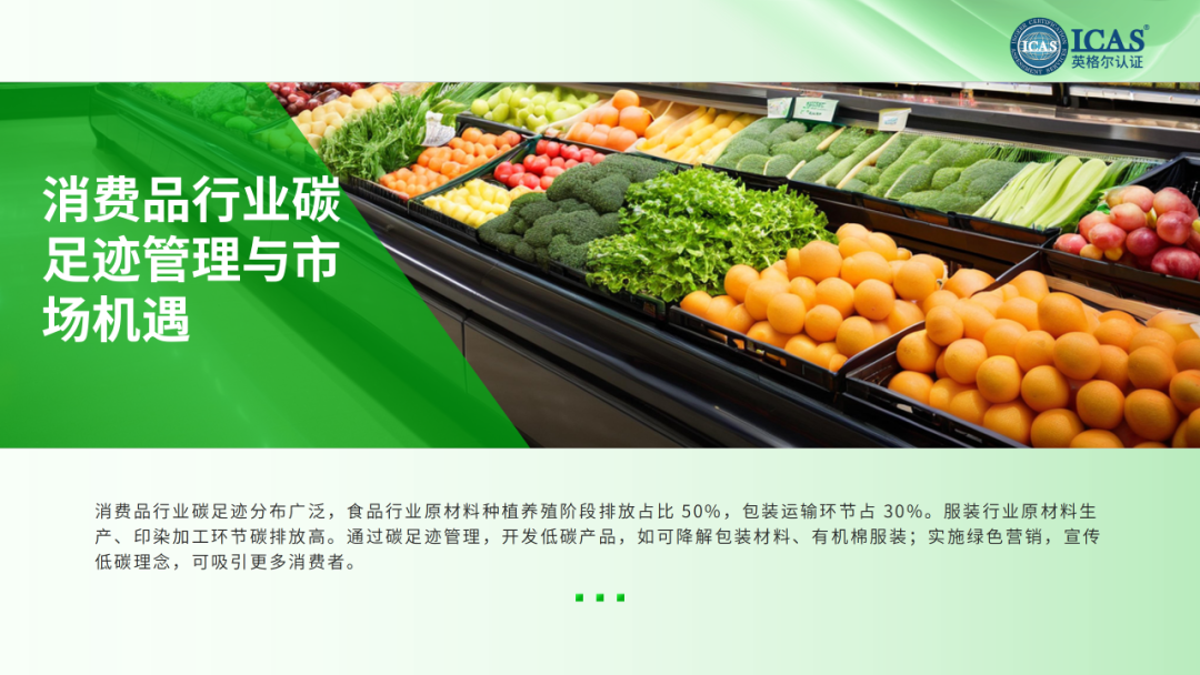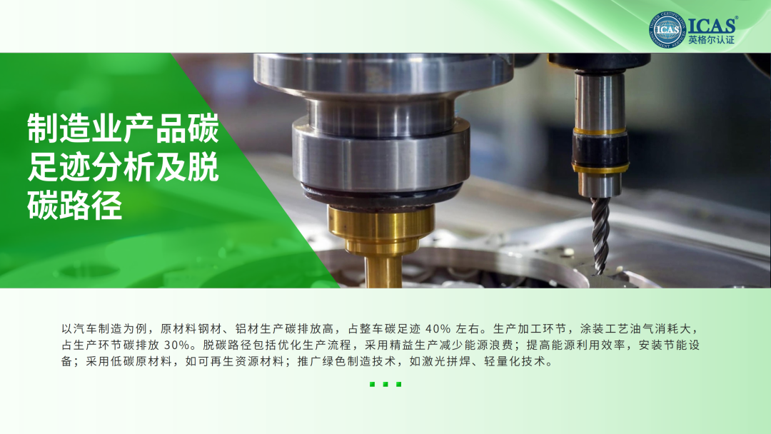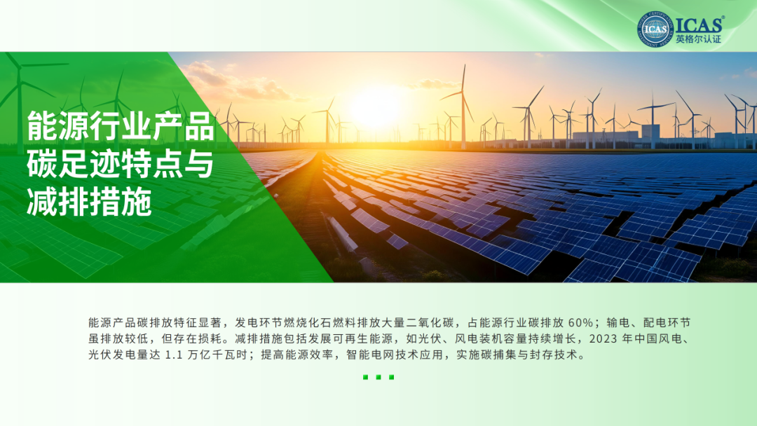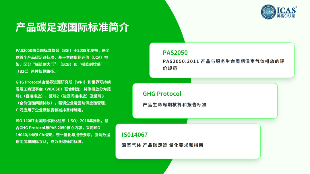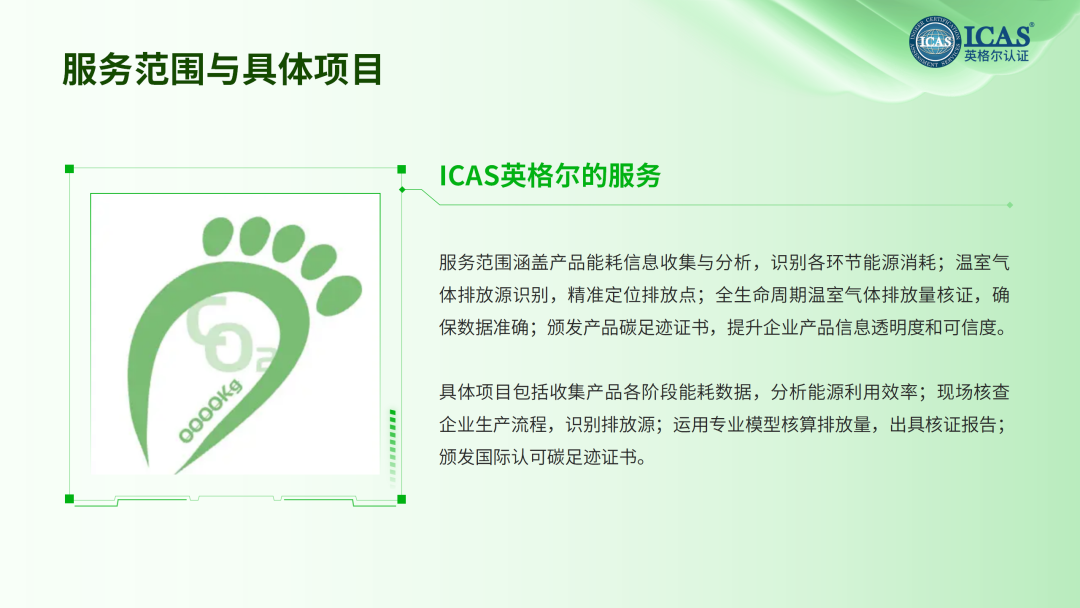 ICAS英格爾認證,作為全球可持續發展領域的踐行者,以“專業驅動變革”為使命,助力企業精準定位碳排放源,優化碳管理流程,實現綠色轉型,通過專業的團隊、科學的評估體系和國際認可的認證標準,ICAS英格爾為企業提供從碳足跡核算到減排策略制定的全方位支持。