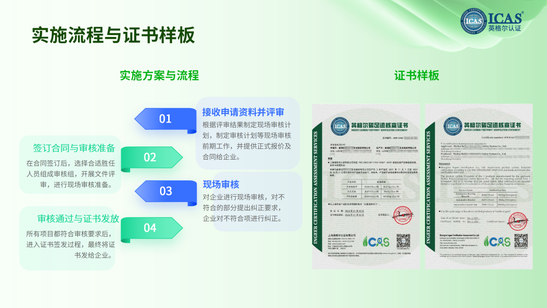 ICAS英格爾的服務流程分為四個階段,從前期資料評審、合同簽訂,到現場審核、不符合項整改,直至最終證書發放,核查服務遵循ISO 14067、PAS2050等國際權威標準,確保核算科學性與結果認可度。