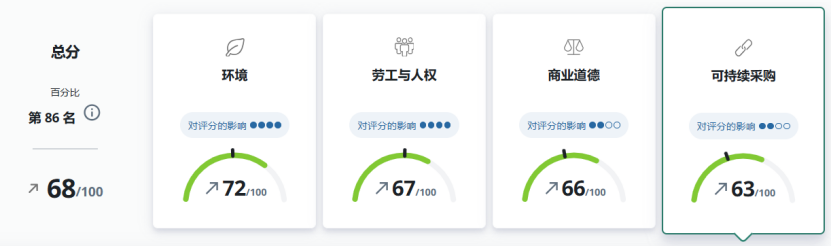 評分躍升:從42分提升至68分,躋身全球同行業前15%,斬獲EcoVadis銀牌。