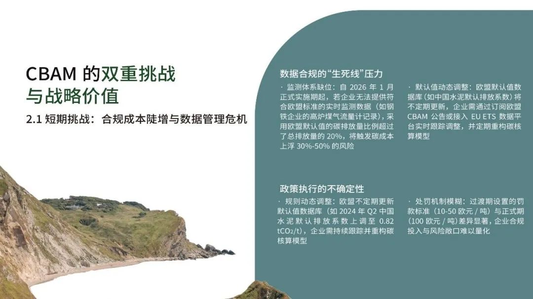 從短期來看,CBAM 給企業帶來了合規成本陡增與數據管理危機。一方面,監測體系缺位和默認值動態調整,使得企業無法提供符合歐盟標準的實時監測數據。另一方面,規則動態調整和處罰機制模糊,讓企業難以量化合規與風險投入。