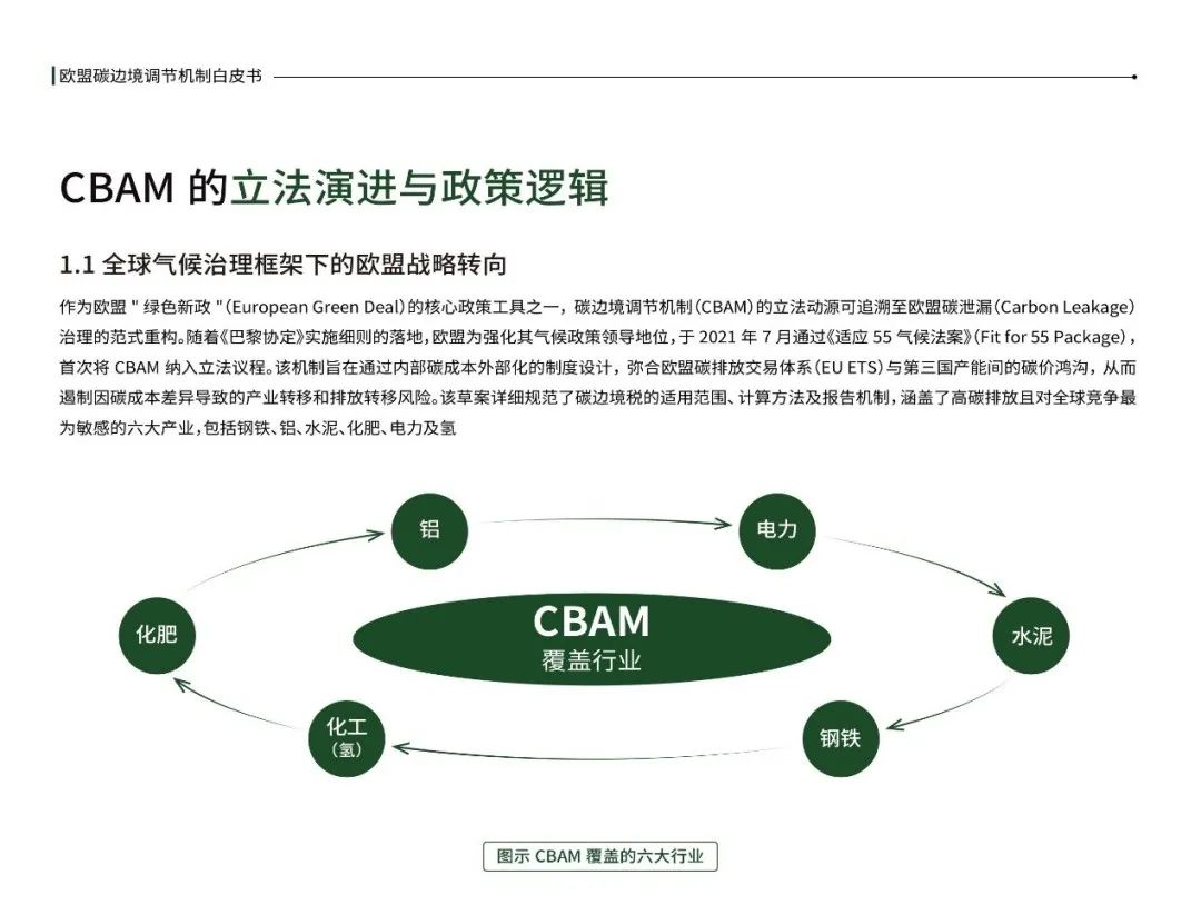 《CBAM白皮書》深度剖析了歐盟碳邊境調節機制的政策邏輯、實施路徑及企業應對策略,為企業提供了清晰的政策導向,同時,從短期合規到長期轉型,提出了優化路徑,助力企業在全球碳市場中占據先機。